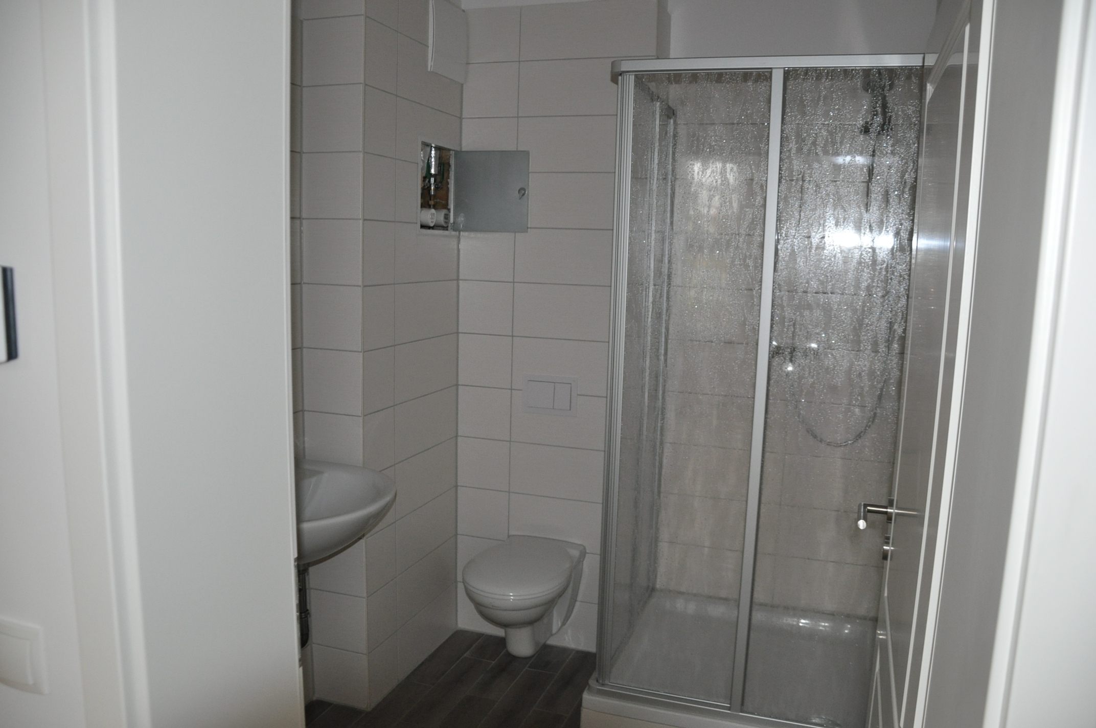 Insgesamt besitzt die 2-Zimmerwohnung ca. 44,00 m² Wohnfläche. Diese verteilt sich auf den in mehrere Bereiche abzugrenzenden Wohn- & Kochbereich mit offen gestalteter Küche, das Schlafzimer und das geschmackvoll gefieste Duschbad mit WM-Anschluss. Selbstverständlich wurden hier nur hochwertige Materialien verwendet, alle aufeinander abgestimmt was Form und Farbe betrifft um ein harmonisches Gesamtbild zu schaffen. Die Ausstattung überzeugt auf den ersten Blick. Gespachtelte Wände in edlem Weiß, großformatige Fliesen in Küche & Bad die im hell – dunkel Kontrast stehen, eine bodengleiche Dusche mit Glasabtrennung und die individuell steuerbare Fußbodenheizung.