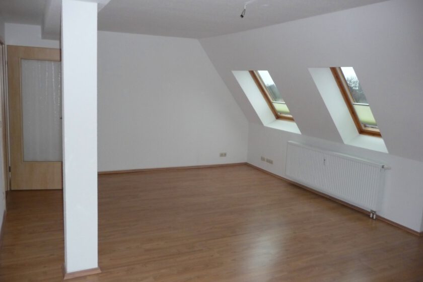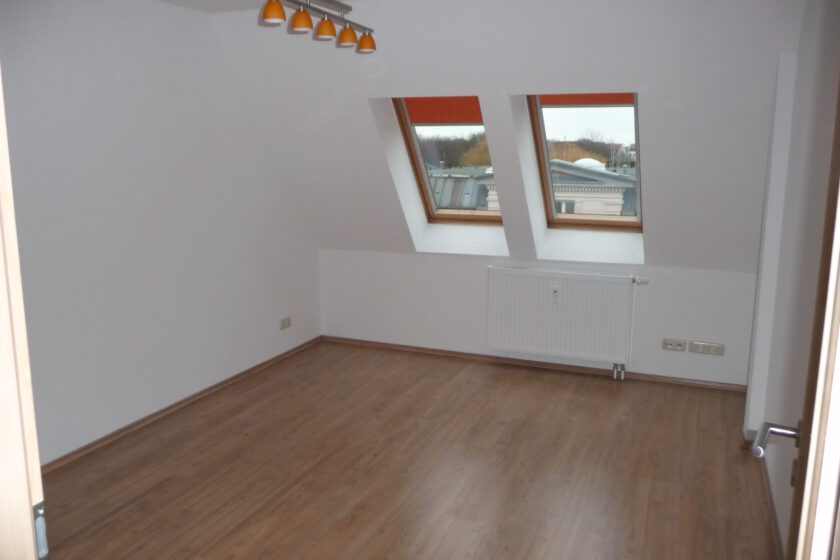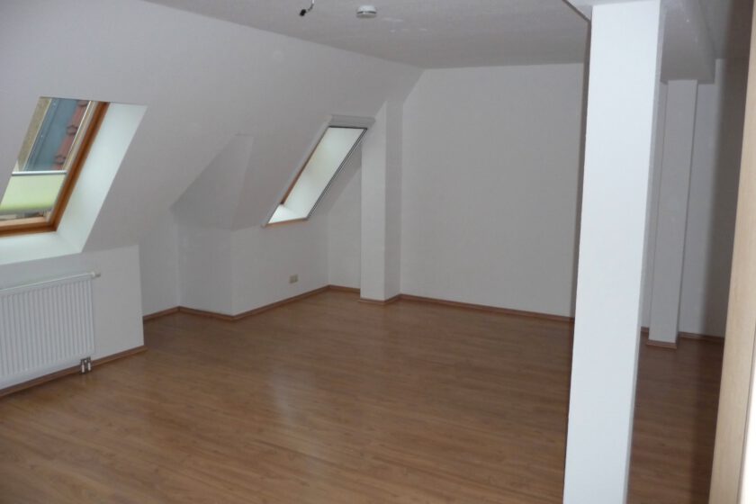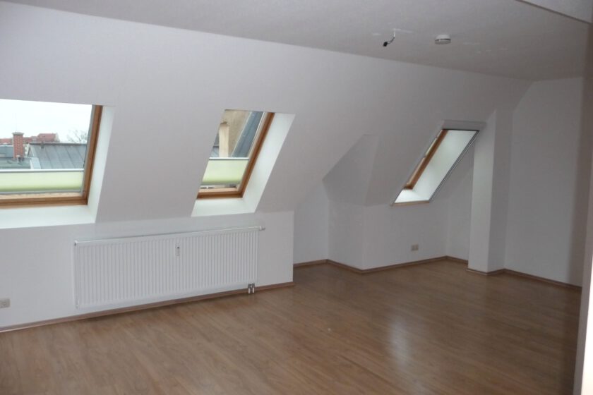 Die Wohnung befindet sich im 4. Obergeschoss eines gepflegten Mehrfamilienhauses und bietet eine Wohnfläche von ca. 88,23 m². Alle Räume sind über den zentralen Flur zugänglich, der zusätzlich einen praktischen Abstellraum beherbergt. Die Raumaufteilung umfasst ein geräumiges Wohnzimmer, zwei Schlafzimmer sowie ein modernes Tageslichtbad mit Badewanne. Beim Betreten der Wohnung fällt sofort die großzügige Raumwirkung des Wohnzimmers sowie die offene Gestaltung des Flurs ins Auge. Der Küchenbereich ist mit Fliesen ausgestattet, während im Wohnzimmer und in den Schlafzimmern hochwertiges Laminat verlegt wurde, was den Räumen eine warme, einladende Atmosphäre verleiht. Die beiden Schlafzimmer sind ebenfalls über den Flur erreichbar und bieten ausreichend Platz für individuelle Möbelgestaltungen. Besonders hervorzuheben sind die großen Doppelfenster, die für eine lichtdurchflutete Atmosphäre sorgen und den Räumen eine freundliche Ausstrahlung verleihen. Das Tageslichtbad besticht durch eine geschmackvolle Fliesengestaltung und eine komfortable Badewanne. Die Fliesenbordüre in einem harmonischen Farbton ergänzt perfekt den Bodenbelag und trägt zur stimmigen Raumwirkung bei. Die Zimmer im Dachgeschoss überzeugen mit charmanten Dachschrägen, die der Wohnung eine ganz besondere Note verleihen und den Charakter dieses Wohnraums unterstreichen.