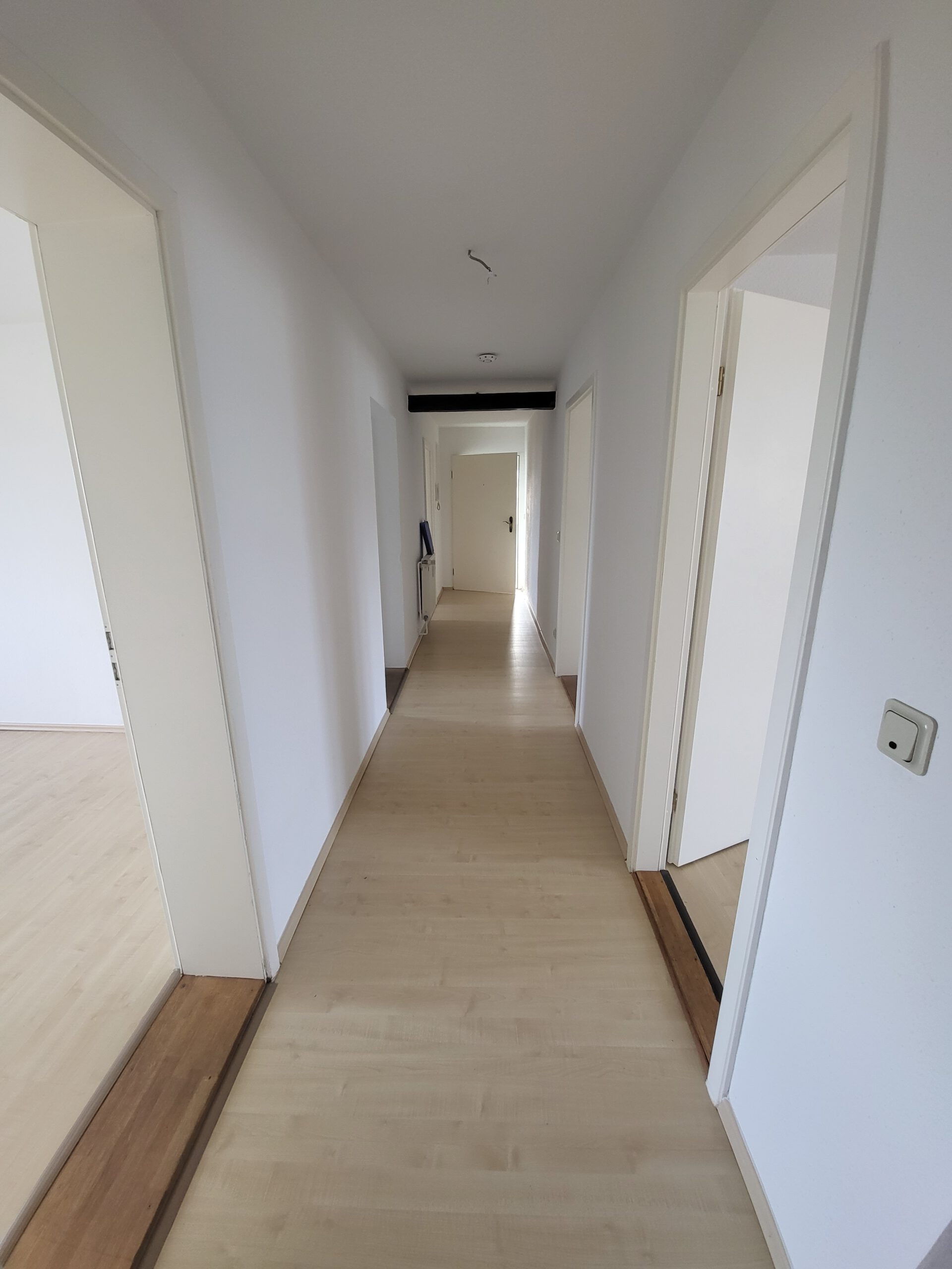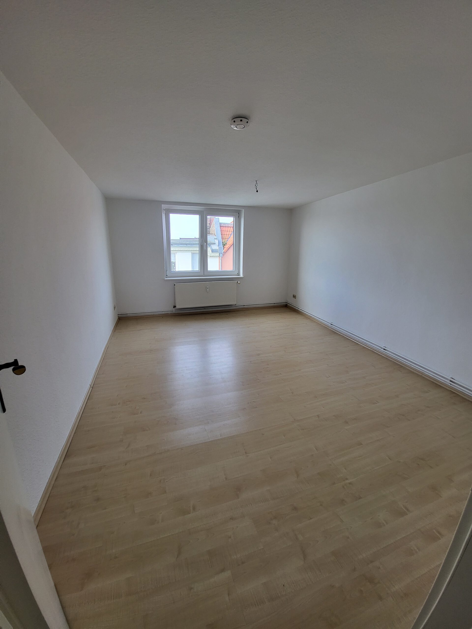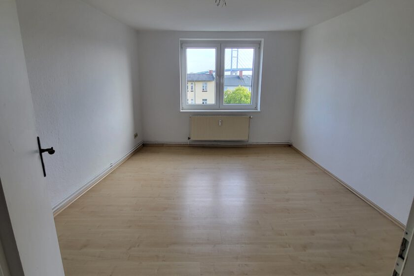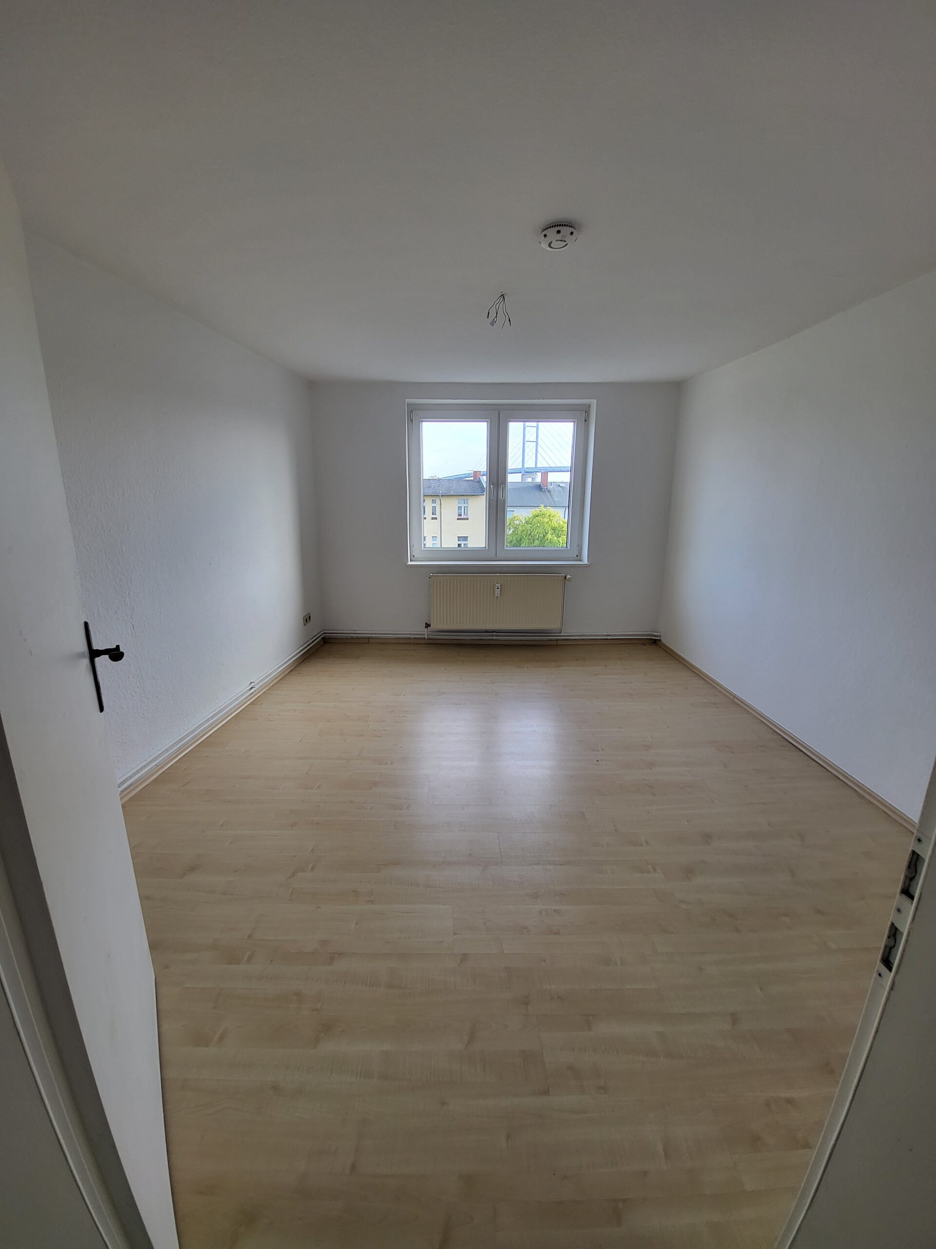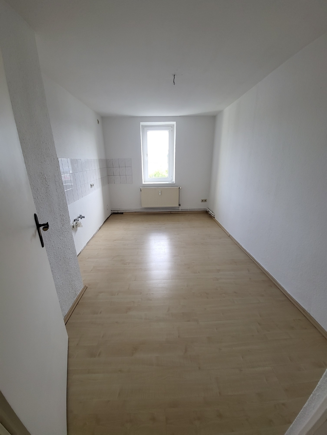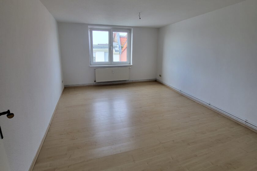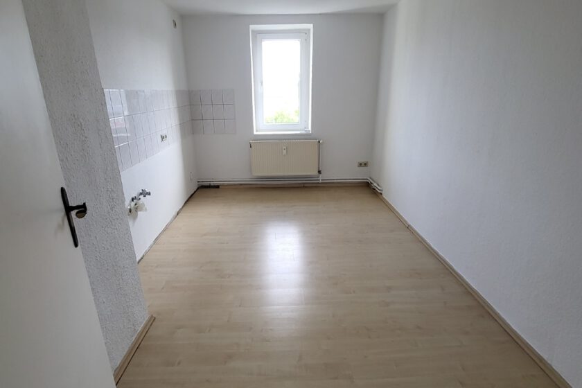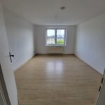 Diese verteilen sich auf Wohnzimmer, Küche, Bad mit Badewanne, zwei Schlafzimmer sowie Flur. Küche und Bad verfügen jeweils über ein Fenster. Die Wohn- und Schlafräume sind mit hellem Laminat ausgestattet, das Badezimmer mit weißen Fliesen.